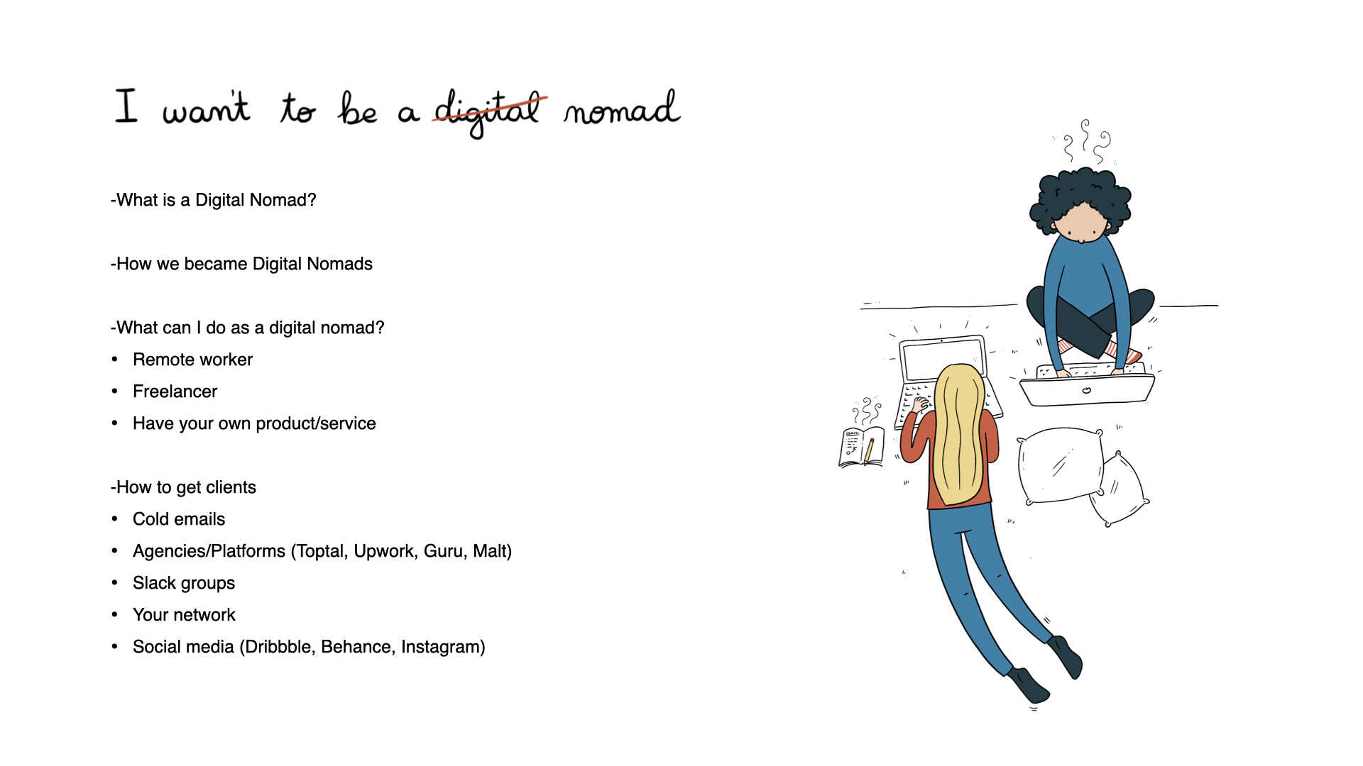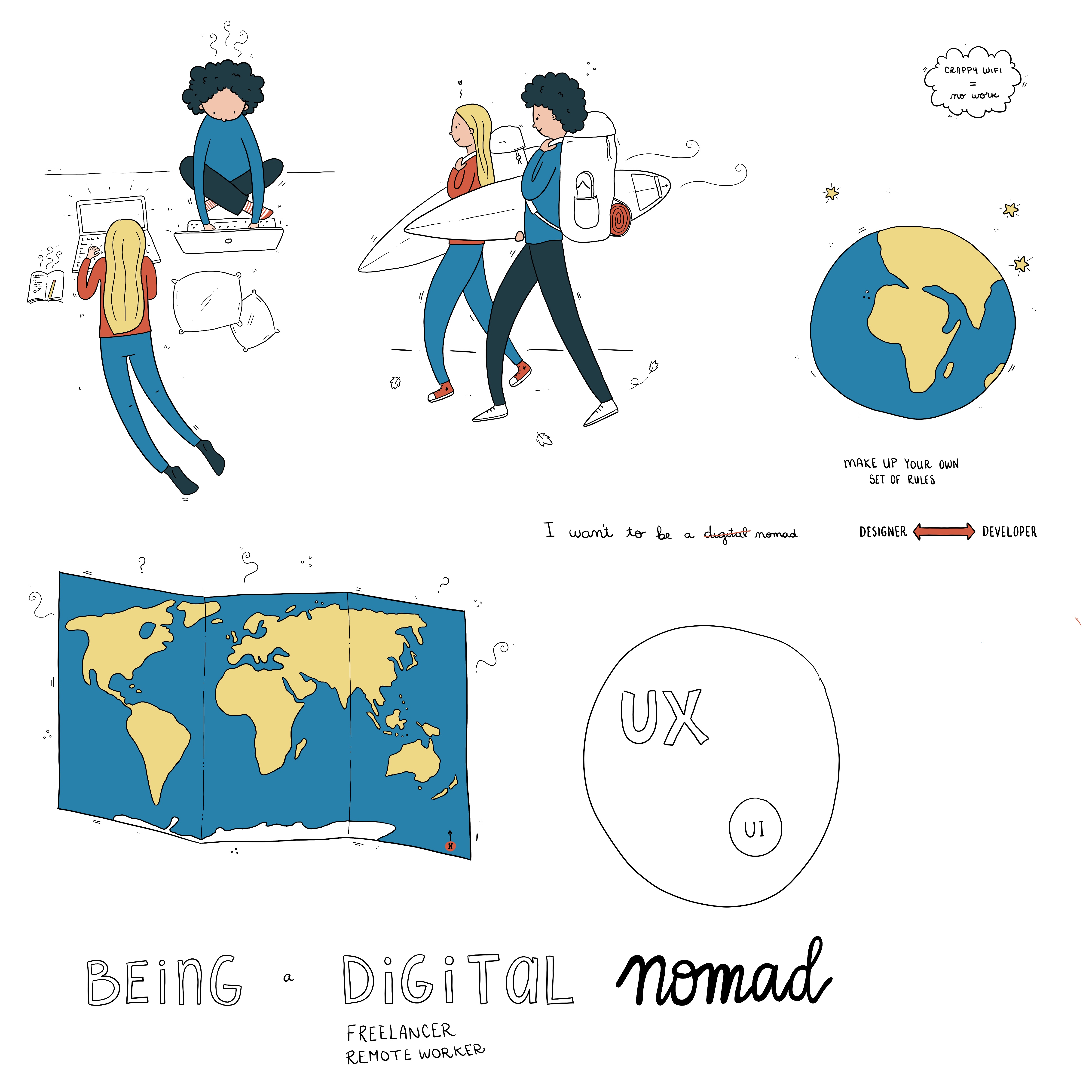 Some illustrations and slides that were part of a talk about being "Digital Nomads for over 10 years" my partner and I gave at Wildcode School Biarritz.